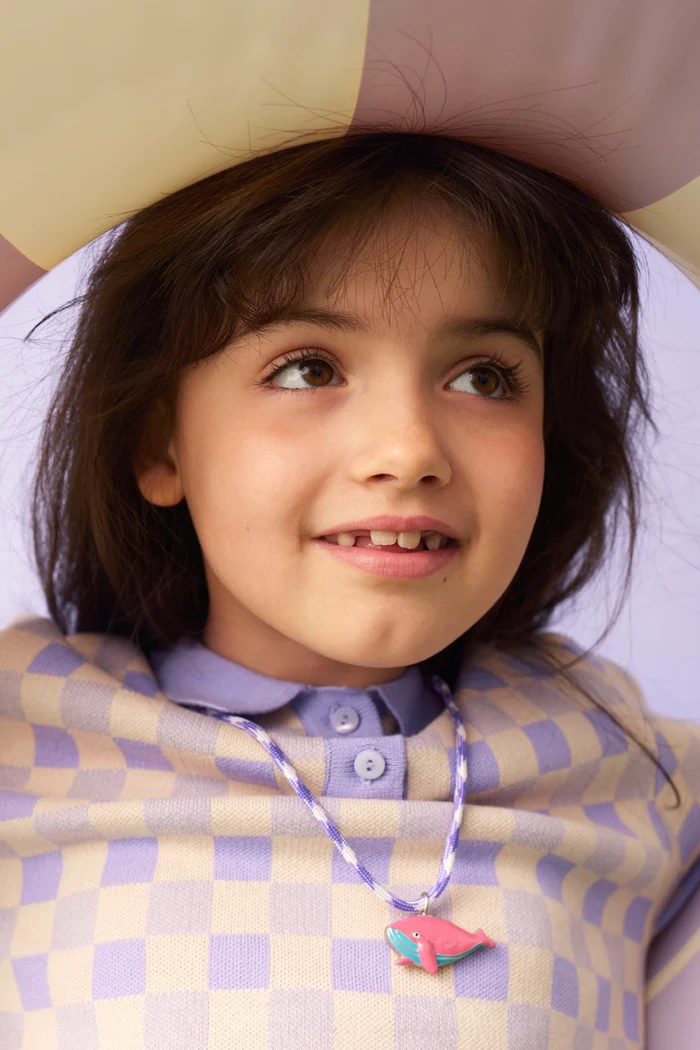 Šis aksesuaras tarsi mini ekosistema ant mažylio kaklo. Spalvingas ir žaismingas banginis, kurio viduje slepiasi mažytis žuveliukas.