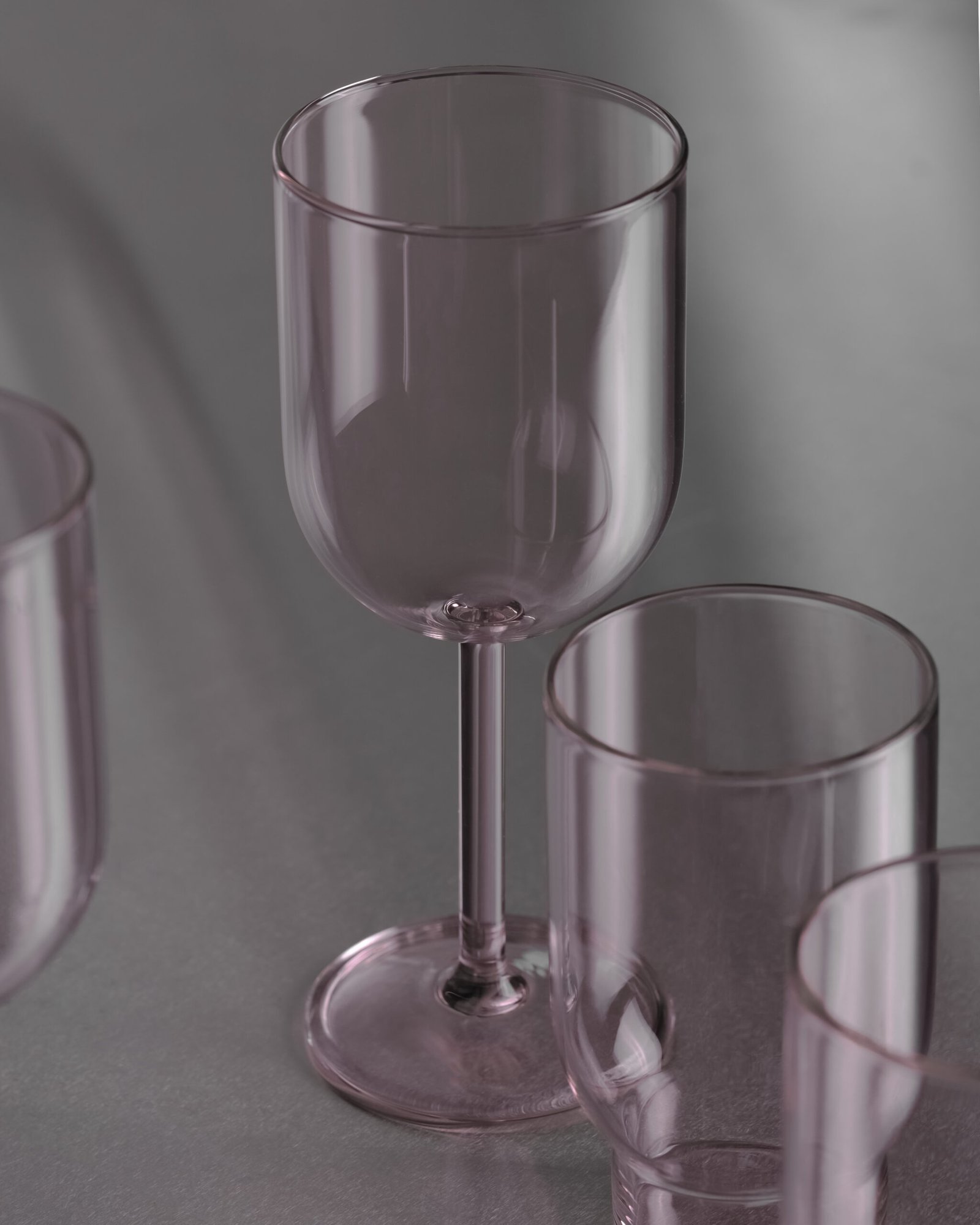 Pilkos spalvos vyno taurės, kurių dizainą kūrė architektas ir dizaineris Mikkel Lang Mikkelsen. Lengva ir minkšta forma, grakšti ilga kojelė.